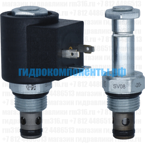 SV08-20-0-N-00 (5000008) Двухлинейный гидравлический клапан (гидроклапан) картриджного (ввертного) исполнения, с электромагнитным управлением, нормально закрытый, тарельчатого типа с пилотным управлением, гнездо SAE8/2 (SAE 08), резьба 3/4-16 UNF-2A, 23 л/мин, 207 бар (HydraForce, США). При снятом напряжении SV08-20 блокирует поток из (2) в (1). При подаче напряжения на электромагнитную катушку гидроклапан пропускает поток из (2) в (1). Электромагнитные катушки приобретаются отдельно.