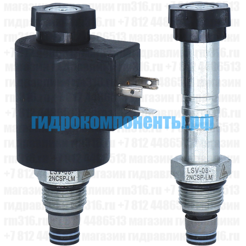 LSV-08-2NCSP-LM Двухлинейный гидравлический клапан (гидроклапан) картриджного (ввертного) исполнения, с электромагнитным управлением, нормально закрытый, тарельчатого типа прямого действия, гнездо SAE8/2 (SAE 08), резьба 3/4-16 UNF-2A, 18,9 л/мин, 250 бар, дублирующее ручное управление (Keta Hydraulics, Китай). При снятом напряжении LSV-08-2NCSP-LM блокирует поток из (1) в (2) и из (2) в (1). При подаче напряжения на электромагнитную катушку гидроклапан пропускает поток из (1) в (2) и из (2) в (1). Электромагнитные катушки приобретаются отдельно.