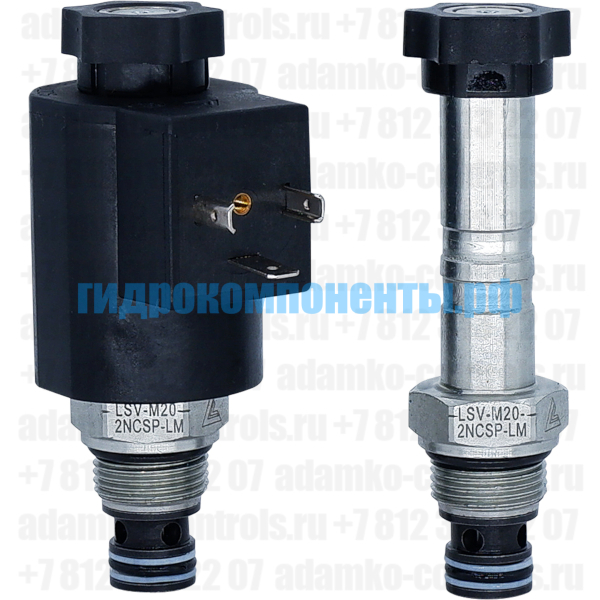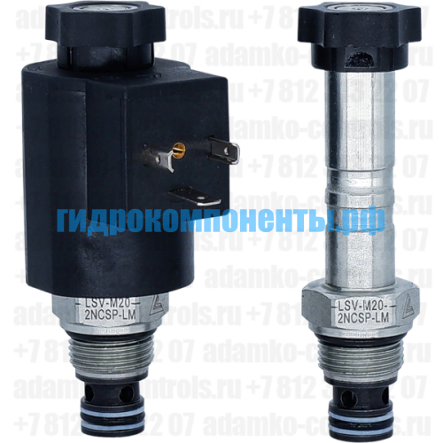 LSV-M20-2NCSP-LM Двухлинейный гидравлический клапан (гидроклапан) картриджного (ввертного) исполнения, с электромагнитным управлением, нормально закрытый, тарельчатого типа прямого действия, гнездо HYDAC 06020, резьба M20x1,5, 18,9 л/мин, 250 бар, дублирующее ручное управление (Keta Hydraulics, Китай). При снятом напряжении LSV-M20-2NCSP-LM блокирует поток из (1) в (2) и из (2) в (1). При подаче напряжения на электромагнитную катушку гидроклапан пропускает поток из (1) в (2) и из (2) в (1). Электромагнитные катушки приобретаются отдельно.