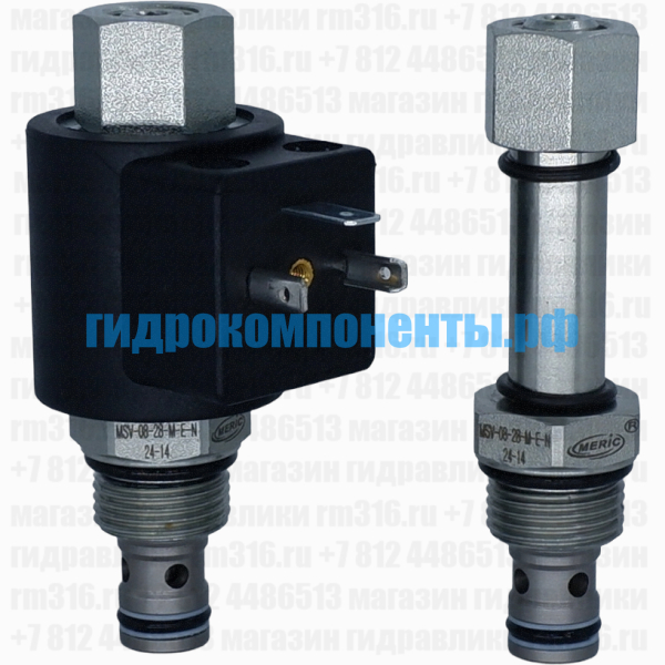 MSV-08-28-M-E-N Двухлинейный гидравлический клапан (гидроклапан) картриджного (ввертного) исполнения, с электромагнитным управлением, нормально закрытый, тарельчатого типа прямого действия, гнездо SAE8/2 (SAE 08), резьба 3/4-16 UNF-2A, 19 л/мин, 207 бар, дублирующее ручное управление (MERIC, Китай). При снятом напряжении MSV-08-28 блокирует поток из (1) в (2) и из (2) в (1). При подаче напряжения на электромагнитную катушку гидроклапан пропускает поток из (1) в (2) и из (2) в (1). Электромагнитные катушки приобретаются отдельно.