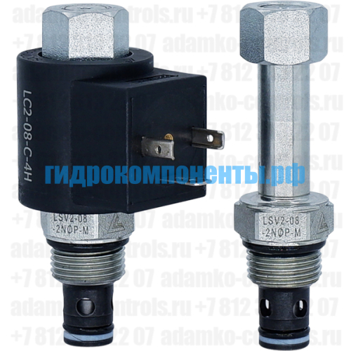 LSV2-08-2NOP-M Двухлинейный гидравлический клапан (гидроклапан) картриджного (ввертного) исполнения, с электромагнитным управлением, нормально открытый, тарельчатого типа с пилотным управлением, гнездо SAE8/2 (SAE 08), резьба 3/4-16 UNF-2A, 37,9 л/мин, 207 бар, дублирующее ручное управление (Keta Hydraulics, Китай). При снятом напряжении LSV2-08-2NOP-M пропускает поток из (2) в (1). При подаче напряжения на электромагнитную катушку гидроклапан блокирует поток из (2) в (1). Электромагнитные катушки приобретаются отдельно.