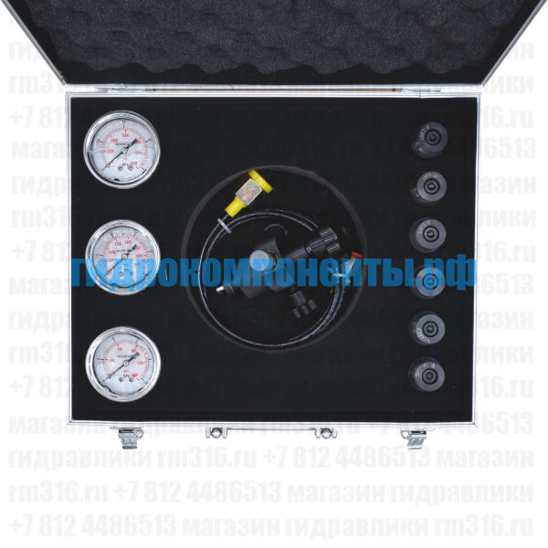 Состав комплекта: чемодан, манометр 0-10 МPa, манометр 0-25 МPa, манометр 0-40 МPa, адаптер для газового клапана M28x1,5 - UNF 5/8", адаптер для газового клапана M28x1,5 - UNF 7/8", адаптер для газового клапана M28x1,5 - UNF 5/16", адаптер для газового клапана M28x1,5 - UNF 1/2", адаптер для газового клапана M28x1,5 - M14x1,5, адаптер для газового клапана M28x1,5 - BSP 1/4", микрошланг длиной 2 м с выходами G 5/8" (для газового баллона) - M14x1,5.