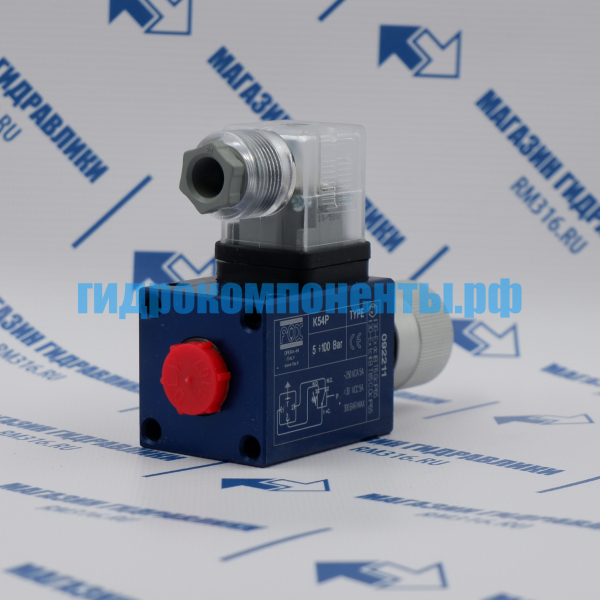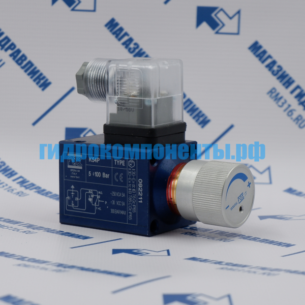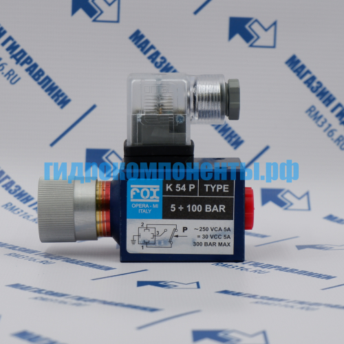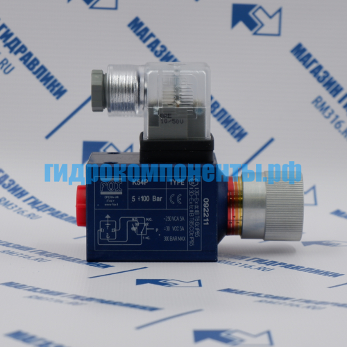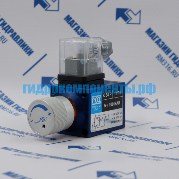 K54P/M4 Настраиваемое реле давления, диапазон регулировки 5-100 бар, макс. рабочее давление 300 бар, коннектор со световым сигналом (Fox, Италия). Реле давления — это устройство, которое реагирует на изменение давления в гидросистеме и включает или отключает электрическую цепь при достижении заданного значения.