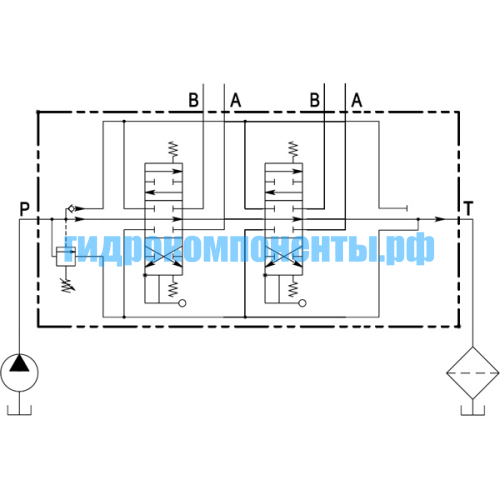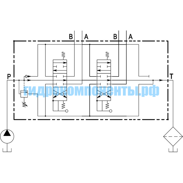 Моноблочный гидрораспределитель Q45/2 F1SN(150)-2X103/A1/M1-F3D с ручным управлением, с регулируемым предохранительным клапаном.