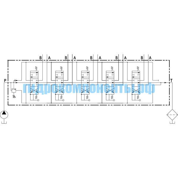 Моноблочный гидрораспределитель Q45/5 F1SN(150)-5X103/A1/M1-F3D с ручным управлением, с регулируемым предохранительным клапаном.
