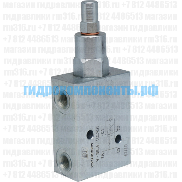 VBCD 1/4" SE/A (V0382) Односторонний тормозной (контрбалансный, уравновешивающий) клапан гидравлический (гидроклапан) с корпусом (сталь), 1/4" BSP, 20 л/мин, 350 бар, 4,5:1, трубный монтаж, диапазон регулировки 100-350 бар (Oleodinamica Marchesini, Италия). Тормозной клапан (клапан торможения) используется для обеспечения плавности работы гидродвигателей (например, гидроцилиндра или гидромотора), а также выполняет функцию гидрозамка. Уравновешивающий клапан V0382 помогает избавиться от рывков и колебаний при действии попутных нагрузок, вектор движения которых совпадает с направлением движения гидроцилиндра или гидромотора. Купить подпорно-тормозные клапаны Oleodinamica Marchesini можно в нашем магазине гидравлики в Санкт-Петербурге. Доставка гидравлических комплектующих Oleodinamica Marchesini осуществляется транспортными компаниями по всей России.
